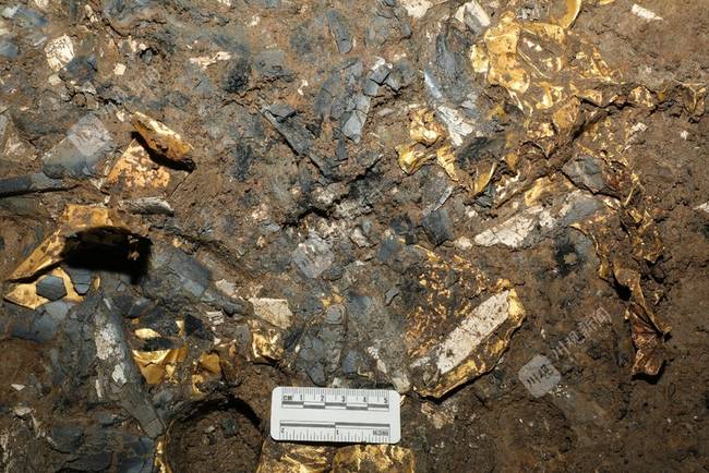 在专家手中,金箔被慢慢展开,真容一点点展现,不出所料,这果然是一件黄金面具!虽然只有半张,但金光灿灿、十分夺目,已足够令现场考古人员们震撼。