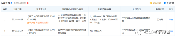 据天眼查信息显示,该企业此前因生产未取得批准文号的特殊用途化妆品等原因被处罚2次。