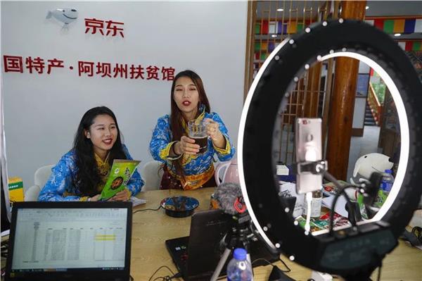 在四川省阿坝藏族羌族自治州松潘县的“中国特产·阿坝州扶贫馆”里,两名主播通过直播平台,帮助松潘当地企业直播销售沙棘饮料等特产(2020年6月17日摄)。新华社记者 沈伯韩 摄
