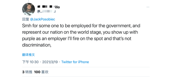美国记者杰克·波索比克(Jack·Posobiec)发推文表示,美国国务卿布林肯带着一头紫色头发的工作人员参加中美高层会议,会被认定为美方“软弱”。波索比克嘲讽布林肯真是个“战略天才”,该推文已经被转载2400余次,获得了1万枚点赞。