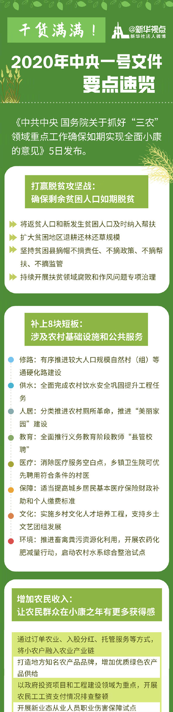 网络整理 2021-03-21 22:58《中共中央 国务院关于抓好“三农”领域重点工作确保如期实现全面小康的意见》5日发布。针对集中力量完成打赢脱贫攻坚战和补上全面小康“三农”领域突出短板这两大重点任务,文件有哪些干货、硬货?戳图