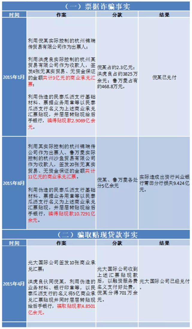 中国裁判文书网公布的此案一审刑事判决书内容显示,浙江省杭州市中级人民法院经审理查明,2015年1月和8月,洪某、鲁某伙同倪某及其他中介人员,利用自己控制的空壳公司虚构贸易背景、签发无资金保证的商业承兑汇票,再使用伪造的民泰瓜沥支行的虚假业务材料、业务印章,以民泰瓜沥支行的名义将24张商业承兑汇票贴现并转贴现给后手银行,以此骗取商业承兑汇票贴现款逾13.6亿元。