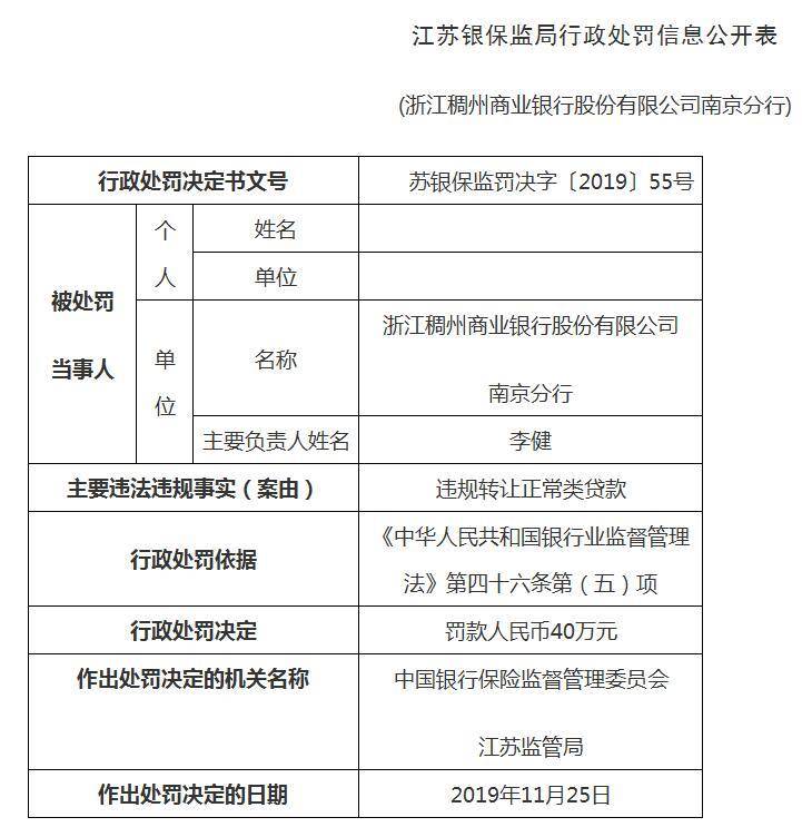 稠州银行南京分行遭罚40万 违规转让正常类贷款