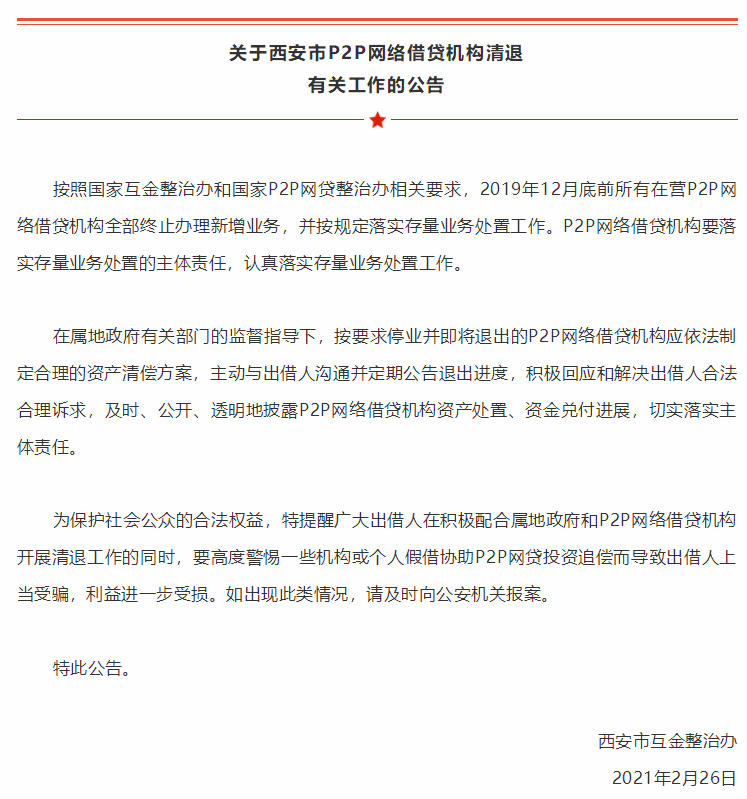 五、#西安:退出P2P机构应制定合理的资产清偿方案#。2月26日,西安市互金整治办发布P2P网络借贷机构清退有关工作的公告,按照国家互金整治办和国家P2P网贷整治办相关要求,2019年12月底前所有在营P2P网络借贷机构全部终止办理新增业务,并按规定落实存量业务处置工作。P2P网络借贷机构要落实存量业务处置的主体责任,认真落实存量业务处置工作。