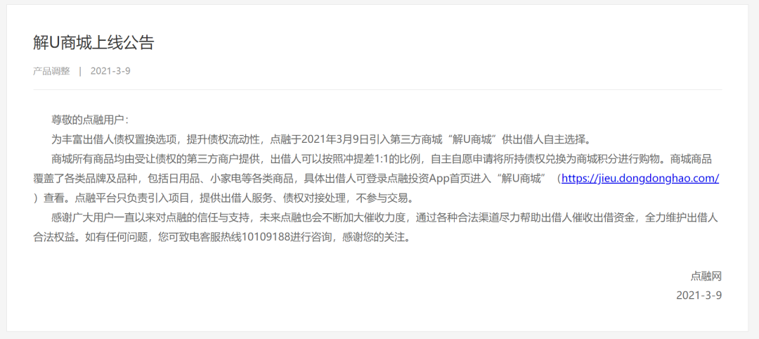 为丰富出借人债权置换选项,提升债权流动性,点融于2021年3月9日引入第三方商城“解U商城”供出借人自主选择。