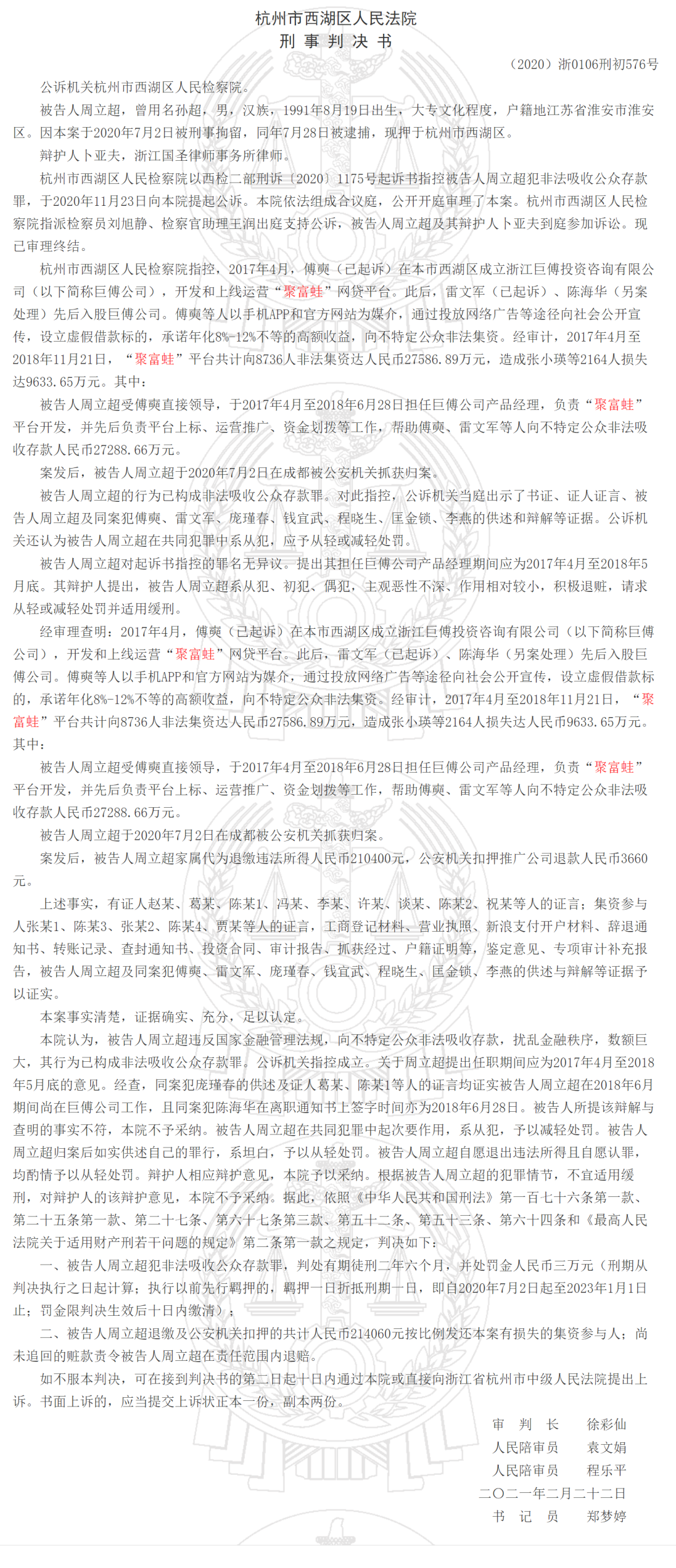 四、聚富蛙。根据(2019)浙0106刑初755号、(2020)浙0106刑初576号,法院对这家平台的判决是:(仅截取金额内容)
