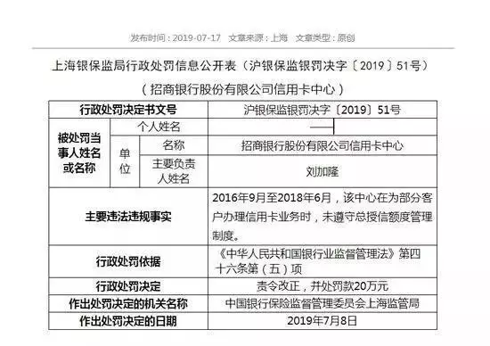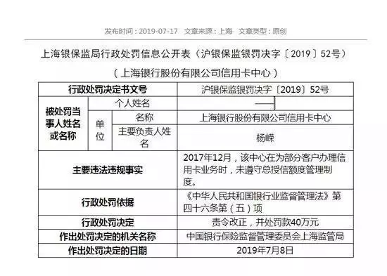 工商银行上海第一支行、招商银行信用卡中心和上海银行信用卡中心因在为部分客户办理信用卡业务时,未遵守总授信额度管理制度的行为分别被罚30万元、20万元和40万元。