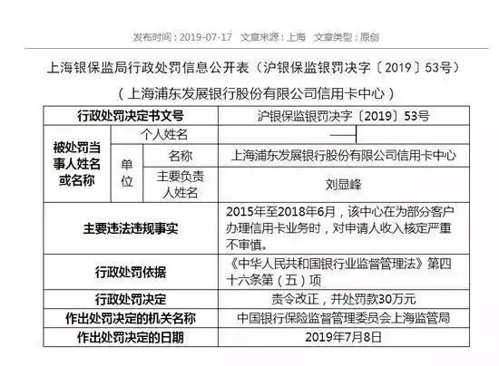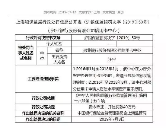网络整理 2021-03-22 11:437月17日,银保监会上海监管局网站接连公布六则行政处罚决定书,对工商银行、兴业银行、招商银行、上海银行、浦发银行和建设银行旗下信用卡业务存在的违法违规行为进行公示,六家银行因未遵守总授信额度管理制度、对申请人收入核定严重不审慎等行为而被处罚金合计达190万元。