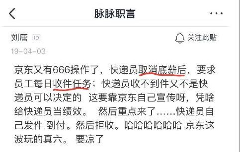 值得注意的是,就在菜鸟裹裹发布这一目标的前一天,京东被曝出了对快递员调整薪酬体系、增加收件任务一事。