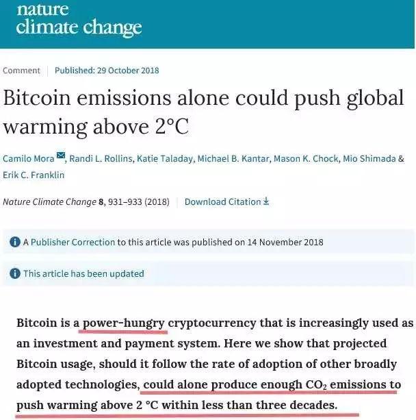 2018年10月发表在期刊Nature Climate Change上的一篇论文显示,仅挖比特币一项就将导致2033年全球气温上升2℃。