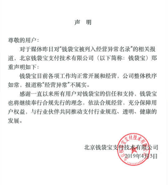 钱袋宝被曝列入经营异常名录?回应:不属实