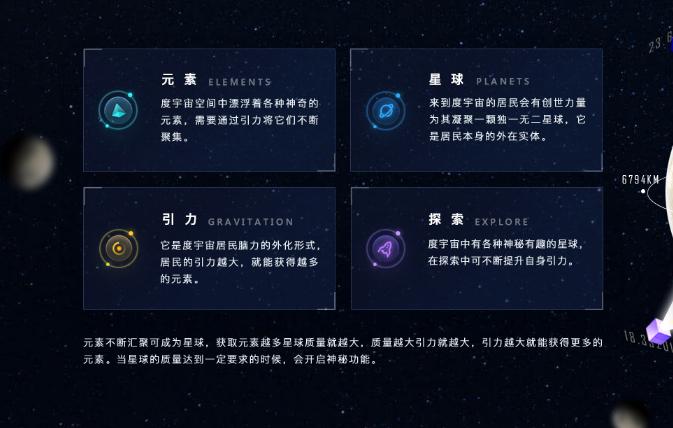 虽然表述很文艺,但是不难从中窥测出这几个概念的实际含义。“引力是居民脑力的外化形式,引力越大,就拥有越多的元素”。脑力或许可以理解为信息与知识,它们通过某种形式转化,形成类似积分的累积,所以引力,相当于积分值;元素,相当于度宇宙里的权益通证,类似网易星球的黑钻。每一个用户拥有自己独一无二的星球,对应的是各自的单点玩法,进行多样化的探索。而“星际旅行”可以构建起用户之间的交互,形成知识与价值的网络结构。