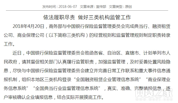 网络整理 2021-03-22 16:382018年4月20日,商务部与中国银行保险监督管理委员会完成典当行、融资租赁公司、商业保理公司(以下简称三类机构)的经营规则和监督管理规则制定职责转隶工作。