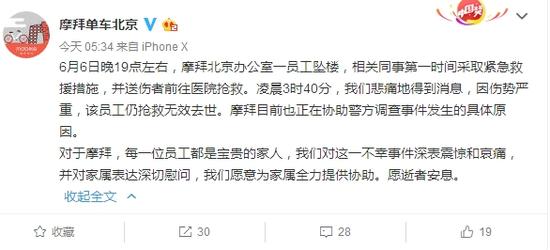 网络整理 2021-03-22 16:386月6日晚19点左右,摩拜北京办公室一员工坠楼,7日上午,“摩拜单车北京”官方微博发布声明称,相关同事第一时间采取紧急救援措施,并送伤者前往医院抢救。凌晨3时40分,因伤势严重,该员工仍抢救无效去世。