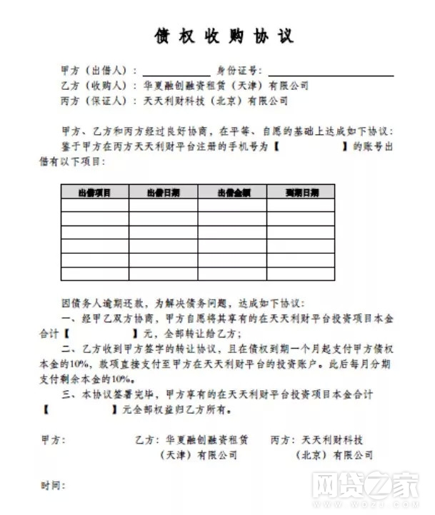 这份协议提出将投资者对理财平台的债权转让给另外一家公司——华夏融创融资租赁(天津)有限公司。金评媒发现,该公司与天天利财的母公司华夏融创企业管理咨询(北京)有限公司的法定代表人都是江浩亮。该协议承诺,会在一个月内支付投资者本金的10%, 之后每个月支付剩余本金的10%。
