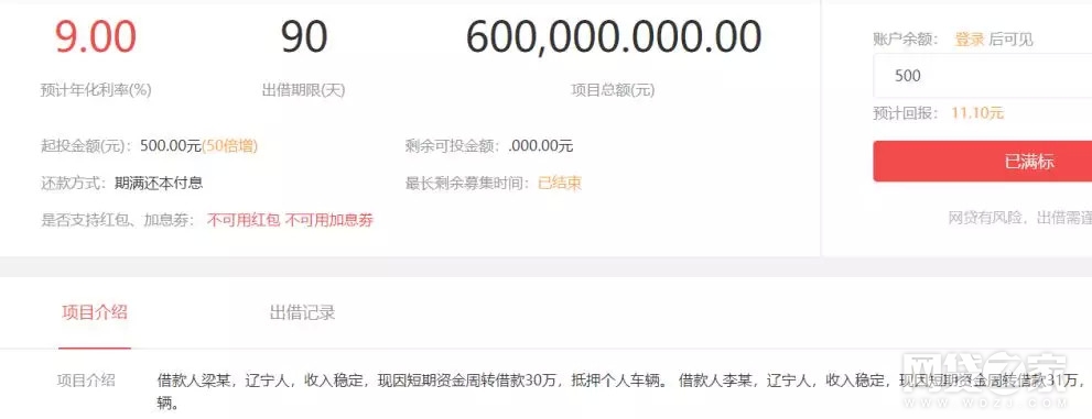 金评媒发现,天天利财平台借款方多为个人借款,但出借金额多次出现超额问题。例如,天天利财“月月丰收No.500”的借款项目,借款金额为60万元,两个借款人每人借款30万。根据“8.24网贷暂行管理办法”,个人在同一网贷平台的借款余额不得超过20万元。