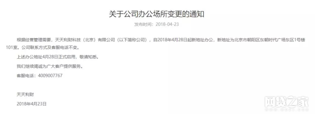 “我投的标的1月份就到期了,4月底的时候我老公去的北京(天天利财总部办公地),公司就说没钱。”一名苏州的投资者吴女士告诉金评媒。记者注意到,天天利财官网于4月份发布了一则通知,公司的办公地址也已经更换。