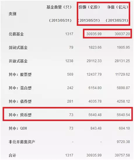 从2013年5月份的数据来看,当时货币基金的规模只有5640亿,不及目前的十分之一,全部公募基金资产净值为3万亿,占比也不到19%,目前的占比是59%。