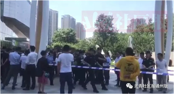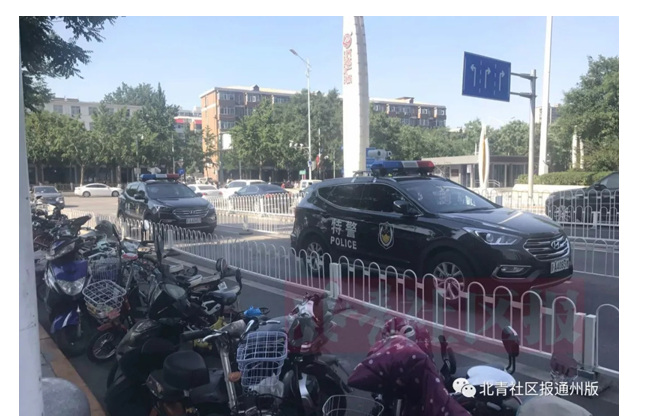 现场拉有警戒线,特警持枪走在队伍前列。本文图片均来自“北青社区报通州版”
