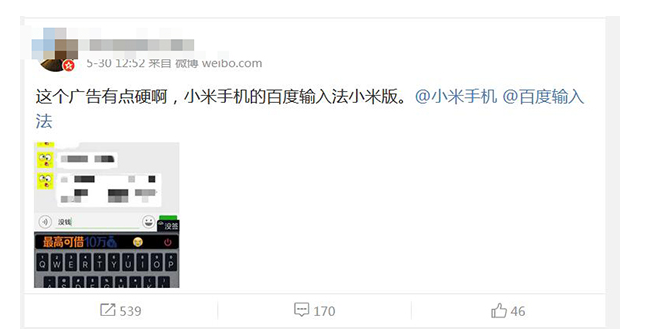 此前一位网友在社交网络上发布的一张截图显示,他使用百度输入法打出“没钱”两个字时,输入法自动联想推荐了“最高可借10万”的借贷广告。据网友提供的信息,他使用的是小米手机的百度输入法小米版。