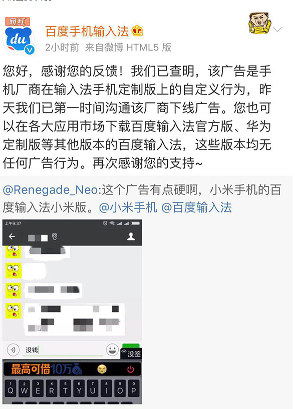 5月31日,百度输入法在官方微博上声明称:“我们已查明,该广告是手机厂商在输入法手机定制版上的自定义行为。”