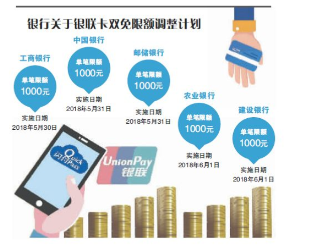 银行“整齐划一”的行动,是为响应银联的计划。银联在4月中旬宣布,自2018年6月1日起,将与各成员机构联合对“小额免密免签”功能进行优化,届时银联芯片借记卡、信用卡的小额免密免签单笔限额将由300元提升至1000元。基于安全用卡的考虑,银行可根据自身的风控系统及风险承受能力,自行调整交易限额以及实施时间。