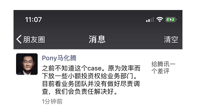 腾讯董事局主席马化腾也在朋友圈中表示,“之前不知道这个case。原为效率而下放一些小额投资权给业务部门。目前看业务团队并没有做好尽责调查,我们会负责任解决好。”