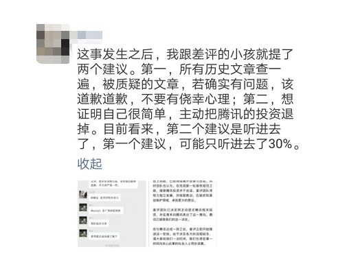 另有接近差评的人士表示,这件事发生后,就提了两个建议:1、所有历史文章查一遍,被质疑的文章,若确实有问题,该道歉道歉,不要有侥幸心理;2、想证明自己很简单,主动把腾讯的投资退掉。