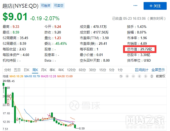 行情数据显示,截止5月23日美股收盘,趣店股价下跌2.07%,报收9.01美元,相较于发行价24美元跌去62%,较上市后的最高价35.45美元跌去75%。雪球数据显示,趣店目前的总市值为29.72亿美元。