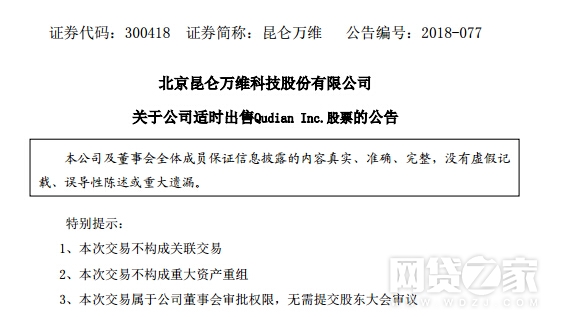 2017年10月18日,昆仑万维曾发布公告称,公司已随同趣店在纽约证券交易所IPO出售昆仑集团所持有的趣店部分股权,共获得收益3.45亿元人民币,占公司2016年经审计净利润的64.93%。