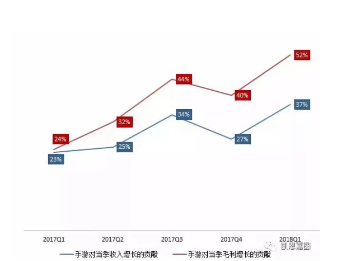 在王者荣耀的带领下,手游已经成为了腾讯业绩最为重要的发动机,其对于腾讯毛利的增长贡献一路上涨,从24%上升到了最新一个季度的52%。