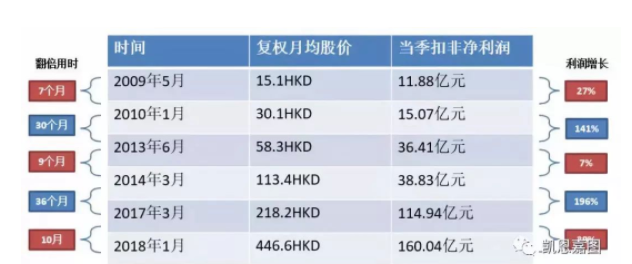 2009年5月,腾讯股价突破70港币,市值接近1300亿港币,在接下来的8年,它的市值翻了接近32倍,如果我们把每次翻倍作为一个时间段分割开来,会发现一个很有意思的现象。