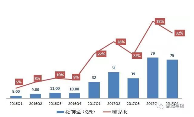 从2017开始,投资收益就成为了腾讯利润的主要组成部分之一,其在利润中的占比逐渐提高,从2016一季度的5%一路提高到2018一季度年的32%,腾讯对于投资收益的愈加依赖,也让腾讯“投行化”的争论愈演愈烈。