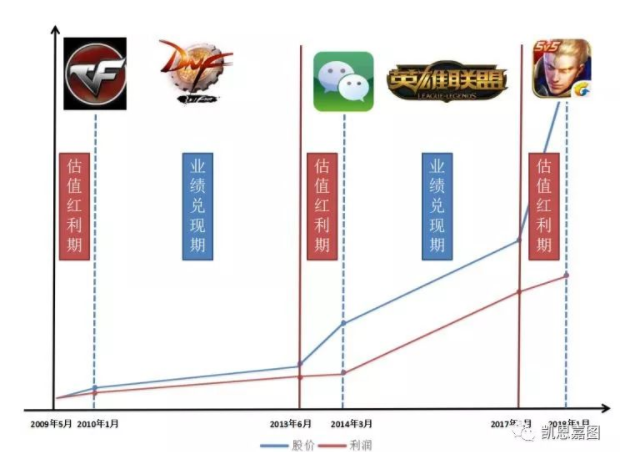 每次当市场意识到腾讯推出了优秀的产品的时,人们往往会对产品的前景产生乐观的预期,这种共识推动了腾讯估值的上涨,即为估值红利期。然后随着这些产品业绩的兑现,市场对于产品变现能力的预期开始落地,在没有新的同级别产品出来之前,股价只会跟随业绩而变化,即为业绩兑现期。
