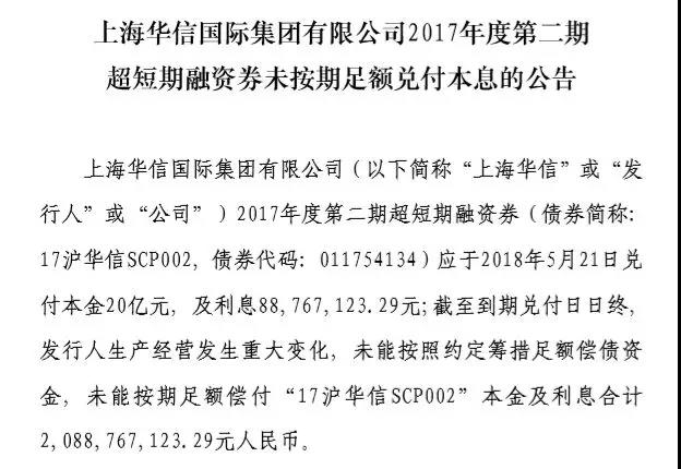 今日晚间,上海华信发布公告称,“17沪华信SCP002”应于2018年5月21日兑付本金20亿元,及利息0.89亿元;截至到期兑付日日终,发行人生产经营发生重大变化,未能按照约定筹措足额偿债资金,未能按期足额偿付“17沪华信SCP002”本金及利息合计约20.89亿元。