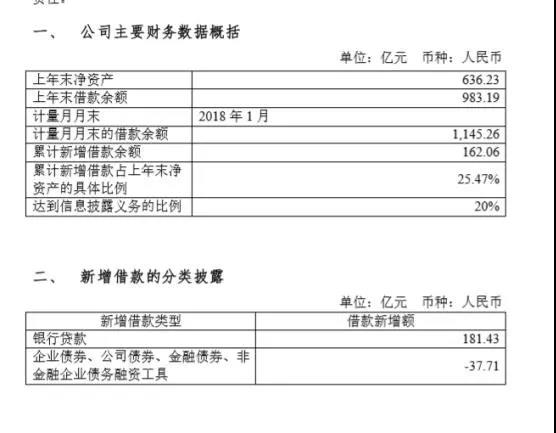根据上交所披露的数据,2017年末,上海华信净资产636.23亿元,借款余额983.19亿元。截至2018年1月末,借款余额1145.26亿元,累计新增借款余额162.06亿元,累计新增借款占上年末净资产的比例为25.47%。在新增借款额中,银行贷款高达181.43亿元。
