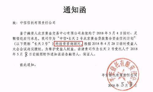 鉴于借款人违约,中信信托发出通知函宣布,信托贷款剩余未发放部分不再进行发放,借款人尚未偿还的信托贷款(本金5.45亿元)于2018年5月4日全部提前到期;并要求借款人北京黄金立即偿还贷款合同项下全部未偿还的信托贷款本金5.45亿元,截止2018年5月4日的利息10509416.67元,以及复利罚息(如有)、违约金(526500.00元)等。另外,中信信托要求保证人中青旅实业立即依据《保证合同》的约定承担保证责任。