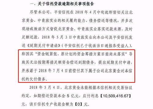 借款人北京黄金2018年5月4日未能按信托贷款相关交易文件约定偿还相应到期本金5亿元,到期应付利息10509416.67元,据交易文件的相关约定,借款人已构成实质违约。