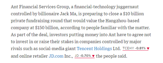 蚂蚁金服投资者不得投资腾讯、京东控制公司?