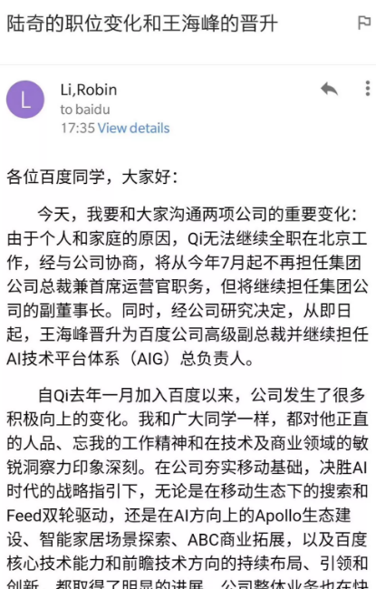 网络整理 2021-03-22 16:53网贷之家综合 5月19日下午5:34,百度创始人李彦宏发布全体邮件,宣布集团总裁兼首席运营官陆奇由于个人和家庭原因,无法继续全职在北京工作,将从7月起不再担任上述职务,但仍将继续担任集团公司副董事长。同时,副总裁王海峰晋升为高级副总裁并担任AIG(AI技术平台体系)总负责人。
