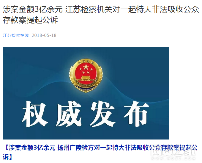 网络整理 2021-03-22 16:53网贷之家讯 5月18日,江苏检察在线微信公众号公示,近日,江苏省扬州市广陵区检察院对一起特大非法吸收公众存款案提起公诉。江苏省扬州市广陵区检察院对一起特大非法吸收公众存款案提起公诉。