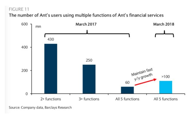 而全天候科技获得的资料显示,据巴克莱银行统计,截至2017年3月,有大约6000万用户使用了蚂蚁金服的所有5项功能(支付、财富管理、金融服务、保险和信用评分),估计到2018年3月将增加到1亿用户。而仅使用两项以上功能的用户则达到了4.3亿。