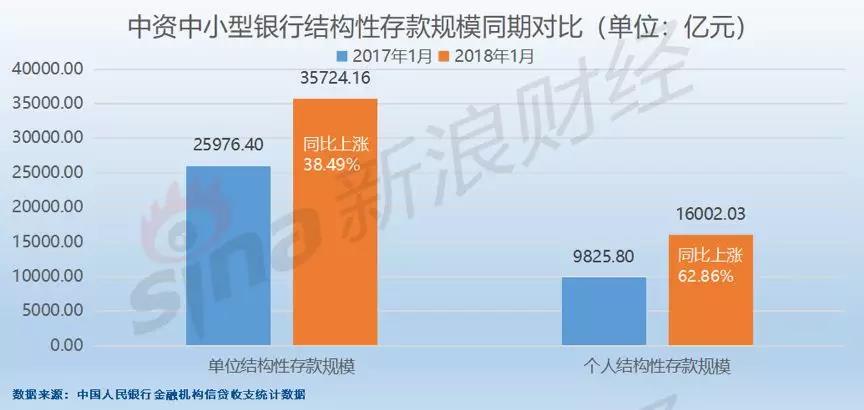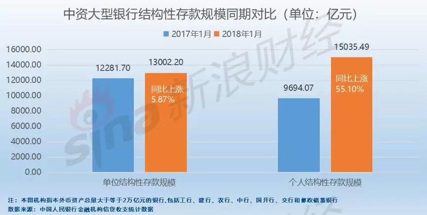 央行官网数据显示,截至2018年1月底,中资大型银行(工、农、中、建、交、邮储、国开行)个人结构性存款规模约1.5万亿元,较去年1月的0.97万亿同比增加55.1%;中资中小型银行个人结构性存款规模约1.6万亿元,较去年1月的0.98亿元同比飙涨62.86%。