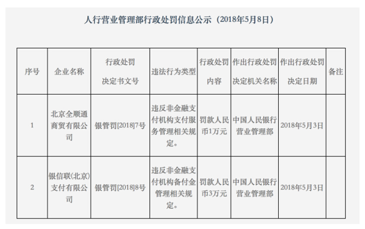 网络整理 2021-03-22 16:57近日,中国人民银行营业管理部(北京)公示的行政处罚信息表显示,北京全顺通商贸有限公司(下称“全顺通”)以及银信联(北京)支付有限公司(下称“银信联”)因违反非金融支付机构备付金管理相关规定,分别被罚款人民币1万元及3万元。作出行政处罚决定日期为2018年5月3日。