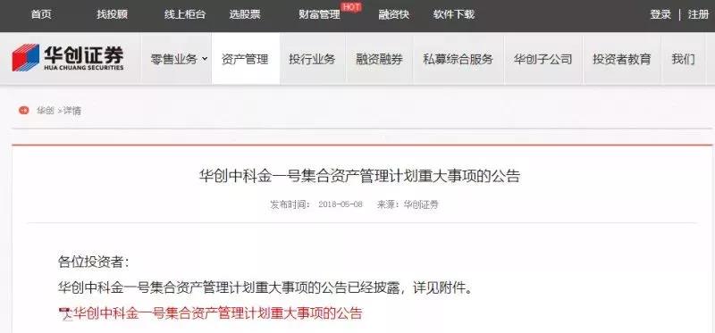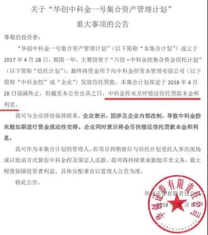 就在三天前,华创证券官网发布了《关于“华创中科金一号集合资产管理计划”重大事项的公告》,告知投资者,由华创证券管理的“华创中科金一号集合资产管理计划”产品本应于今年4月28日届满终止,主要投资于“川信•中科金控集合资金信托计划”。但是至今,资金最终投向方——中科金控未及时偿还信托贷款本金和利息。