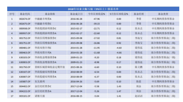 值得注意的是,华商旗下有5只债基(份额合并计算)今年以来出现了5%以上的亏损,其中,华商稳固添利债券、华商信用增强债券、华商双债丰利已经出现10%以上的亏损,分别达到-22%、-17%、-11%。