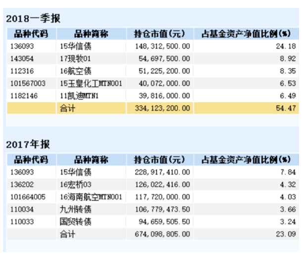 在华商双债丰利的前5大重仓债券名单中,15华信债、11凯迪MTN1均已经违约,而17现牧01已经被交易所暂停上市交易,该债的估值也持续被下调。15玉皇化工MTN001是山东玉皇化工有限公司发行的债券,但这家公司的2017年报、2018年一季报均尚未公布,潜在风险较大。