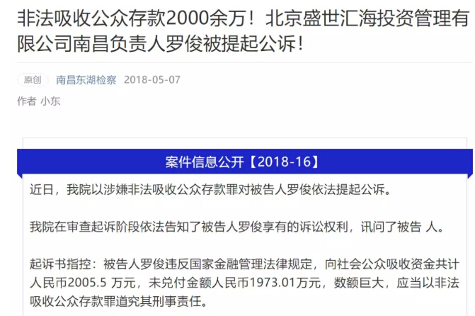 网络整理 2021-03-22 16:58近日,北京盛世汇海投资管理有限公司南昌负责人罗俊涉嫌非法吸收公众存款罪,被南昌市东湖区检察院依法提起公诉,涉及非法吸存金额达2000万元。