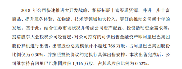 该公告称,公司董事会提请股东大会授权公司经营层,对公司持有的可供出售金融资产即阿里巴巴集团股份择机进行出售,出售股份总规模预计不超过766万股,占阿里巴巴集团股份比例仅为0.30%,并按照投资协议约定执行具体出售安排。