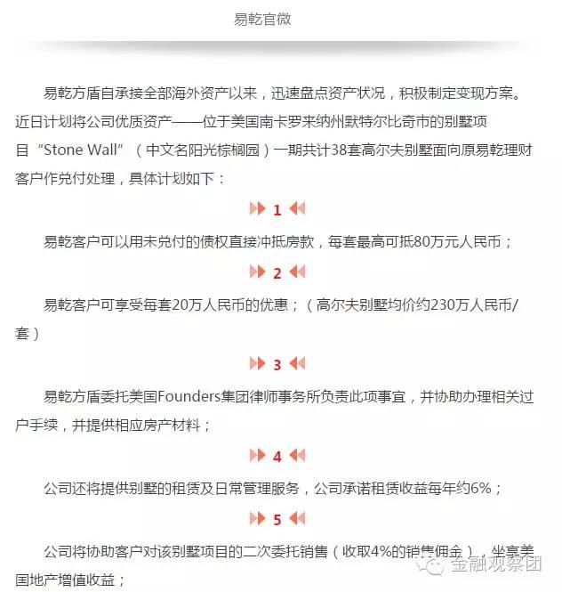 2016年9月22日,易乾财富子公司易乾方盾推出一期共计38套高尔夫别墅面向原易乾理财客户作兑付处理,客户可以用未兑付的债权直接抵充放款,每套最高可抵80万元。